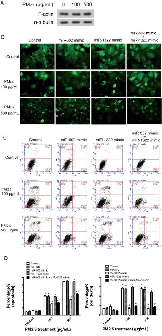 F-actin in A549 cells was stained using the Actin-Tracker Green Kit (Beyotime, China), according to the manufacturer’s protocol. Briefly, A549 cells were seeded in a 6-well plate and treated with PBS, 100 μg/mL or 500 μg/mL PM2.5, with or without miR-802 mimic, miR-1322 mimic, miR-802 and miR-1322 mimic rescues for 24h in 6-well plates, and then fixed in 4% PFA for 10 min. The Actin-Tracker Green was diluted by 1:80 with 0.1% Triton X-100/1% BSA/PBS, and 200 μL working solution was applied to each well for 20 min at room temperature. After washing with 0.1% Triton X-100/PBS three times, the actin morphology was observed under a fluorescent microscope (Olympus, Japan).