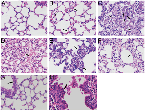 The severity of pathological changes was scored according to Szapiel’s method [43], with minor modifications: 0 = no apparaent alveolitis; 1 = mild alveolitis with inflammatory cell infiltration and alveolar septum thickening, with only local lesions or those limited to the subpleural areas that did not exceed 20% of the lung; 2 = moderate alveolitis with the involved area more than 20% but less than 50% of the lung; 3 = severe alveolitis with lesions more than 50% but less than 75% of the lung and consolidation changes; and 4=severe alveolitis with lesions more than 75% of the lung, with inflammatory cells inside the alveolar cavity and consolidation changes.