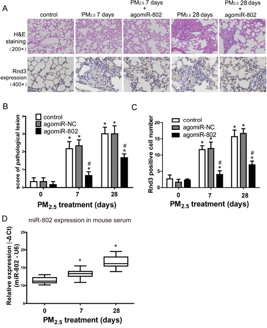 A total of 54 male C57BL/6 mice (20–22 g) were purchased from Shanghai SLRC Laboratory Animal Co. Ltd. (China). Mice were maintained and used according to the guidelines of the Committee on Animal Use and Care of Southeast University. The dynamic inhalation exposure chamber was outfitted with extensive air quality monitoring equipment and an aerosol generator. Mice were divided into nine groups (six mice per group) as follows: control, control with agomiR-802, control with agomiR-NC; mice exposed to PM2.5 for 7 days, mice exposed to PM2.5 for 7 days with agomiR-802, mice exposed to PM2.5 for 7 days with agomiR-NC; mice exposed to PM2.5 for 28 days, mice exposed to PM2.5 for 28 days injected with agomiR-802, and mice exposed to PM2.5 for 28 days with agomiR-NC. Mice were housed six per cage on corncob bedding with ad libitum access to food and water. Exposure was performed in two stainless steel whole-body inhalation chambers. One chamber received PM2.5, and the other received HEPA-filtered clean air at the same flow rates as the experimental groups. Mice were exposed in each chamber for 6 h per day, from 9 a.m. to 3 p.m. and the mean concentrations of PM2.5 were 0.3 mg/m3. Light cycles were set on a 12/12 h light/dark cycle. The temperature in the chambers was set to 22.5°C. The cholesterol-conjugated miR-802 mimics and negative controls (agomiR-802 and agomiR-NC, respectively) (Ribobio, China) were injected via the tail vein on treatment days 0, 7, 14 and 21 at a dose of 4 mg/kg.