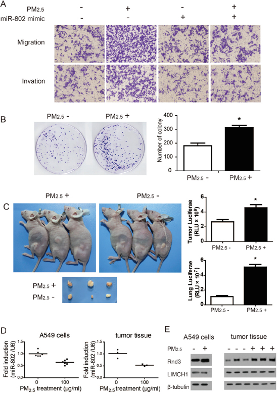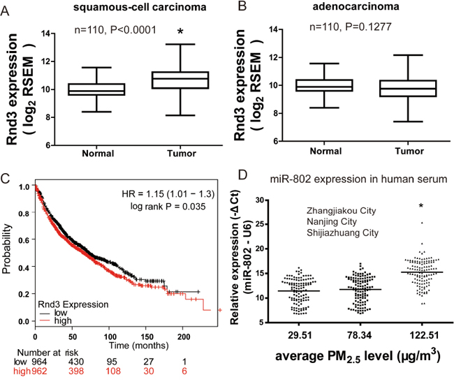 Values of cell viability, apoptosis and mitochondrial dysfunction assays were expressed as mean ± standard error of the mean (SEM). Statistically significant differences were determined by one-way ANOVA, followed by Dunnett’s multiple comparison tests for apoptosis, cell death and Rnd3 expression in lung tissues. The Kruskal-Vallis test was used for the ranked data of pathology score analysis. The methods of t-test was used to compare the results of colony formation, TCGA retrieved data, miR-802 expression in A549 and tumor tissues after long-term PM2.5 exposure. The method of 2–ΔΔCt was used to analyze the qRT-PCR results in cellular experiments. The method of –ΔCt was used to express the results of qRT-PCR in mouse and individual serum samples. Statistical analysis was performed using SPSS 12.0, and the significance was set at P < 0.05