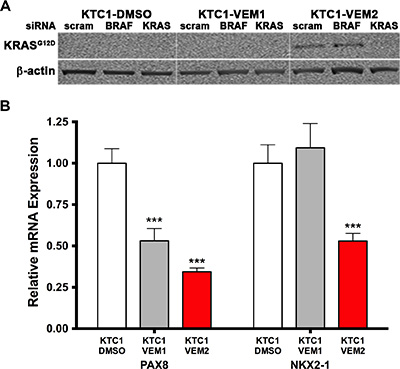 To understand long-term effects of vemurafenib treatment, we continuously exposed KTC1 cells to two different doses of the inhibitor or dimethyl sulfoxide (DMSO) vehicle and followed the fate of these cells over 5 months (20 passages). Three heterogeneous subpopulations of KTC1 cells were obtained and labeled as DMSO (control cells, treated with DMSO vehicle), KTC1-VEM1 (treated with 0.25 μM vemurafenib), and KTC1-VEM2 (treated with 1.0 μM vemurafenib). Short-tandem-repeat (STR) fingerprint analysis (Table 1) indicated that all three subpopulations retained the original KTC1 cell profile published by Schweppe and colleagues [18]. To look for the acquisition of potential “gateway” mutations, we performed a screen for a panel of 420 mutations commonly found in cancers (Supplementary Table 2). The analysis uncovered that the KTC1-VEM2 subpopulation acquired a point mutation in codon 12 (G12D, c.35G > A) of KRAS, which was not found in the other long-term treated cells or original KTC1 line by Sanger sequence analysis. This acquired mutation was confirmed in Western blots using an antibody specific for the KRAS G12D mutation (Figure 2A). Knockdown of KRAS using siRNA confirmed the specificity of the antibody; scrambled and BRAF-specific siRNA were used as controls. Additionally, we performed Droplet Digital™ PCR (ddPCR) and calculated that 50% of cells in the KTC1-VEM2 subpopulation harbored the KRAS G12D mutation at passage 21 of long-term vemurafenib treatment (Table 2). The BRAF V600E mutation was found in 100% of all cell lines and KTC1 subpopulations used in this study. The G12D point mutation renders KRAS insensitive to the actions of GTPase-activating proteins, locking KRAS in an active state [19]. Moreover, activating RAS mutations have been associated with poorly differentiated disease [20–23]. Consistent with this association, expression of the thyroid follicular cell differentiation markers PAX8 and NKX2-1 was decreased in our BRAF/KRAS-mutant cells (KTC1-VEM2) compared with control cells (Figure 2B). In the KTC1-VEM1 cells, only PAX8 marker was decreased.