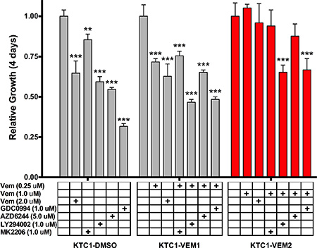 Figure 3: Four-day growth curves performed on KTC1 subpopulations (A) KTC1-DMSO; (B) KTC1-VEM1; (C) KTC1-VEM2) with and without PI3K/AKT and RAF/MEK/ERK pathway inhibitors. Cells were treated on day 0 with either no inhibitor (DMSO only), vemurafenib alone (2.0 μM), the vemurafenib concentration each subpopulation was exposed to during long-term passaging (KTC1-DMSO, none; KTC1-VEM1, 0.25 μM; and KTC1-VEM2, 1.0 μM), or vemurafenib in combination with kinase inhibitors for AKT (1.0 μM MK2206), PI3K (1.0 μM LY294002), MEK (5.0 μM AZD6244), and ERK1/2 (1.0 μM GDC0994). Points represent fold growth each day of treatment normalized to cell number counted just prior to treatments for each subpopulation. Dotted lines represent DMSO and 2.0 μM vemurafenib treatments of the KTC1-DMSO cells on each figure.