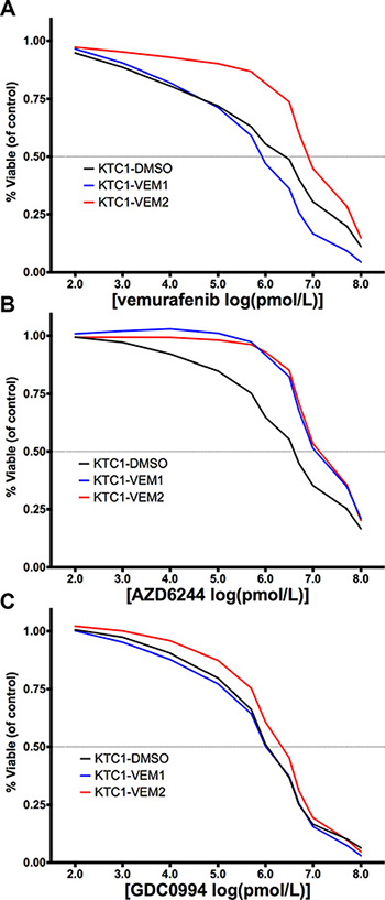 Figure 5: Dose-response curves (percentage of treated cell number compared with DMSO-treated control) for KTC1 subpopulations treated for 4 days with (A) vemurafenib, a BRAF V600E inhibitor; (B) AZD6244, a MEK inhibitor; and (C) GDC0994, an ERK/1/2 inhibitor at the doses described in Supplementary Table 3. The x-axis represents the log-transformed inhibitor dose concentration in pmol/L. The BRAF V600E/KRAS G12D mutant cells are displayed as red lines.