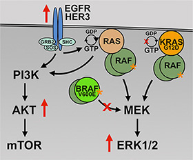 Figure 9: Proposed mechanism of vemurafenib resistance. In the presence of BRAF V600E inhibition (large red X), the BRAF/KRAS mutant cells, KTC1-VEM2, are able to drive activation of survival and proliferation pathways (PI3K/AKT and RAF/MEK/ERK) through the KRAS G12D mutation and increased RTK (EGFR and HER3) activation. The KRAS G12D mutation is insensitive to the actions of GTPase-activating proteins (small red X) and is constitutively active (orange asterisk).