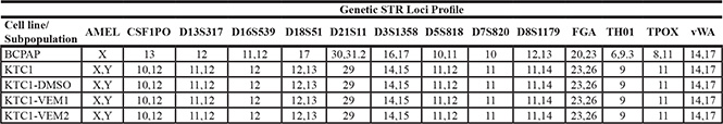 KTC1 subpopulation identities are matched to the original KTC1 cell line and compared with the BCPAP cell line using short tandem repeat (STR) DNA fingerprinting