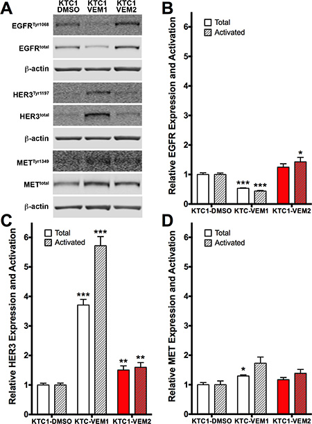 Figure 7: Receptor tyrosine kinase (RTK) expression and activation in KTC1 subpopulations following long-term exposure to DMSO (KTC1-DMSO) or vemurafenib (KTC1-VEM1 and KTC1-VEM2). (A) Western blots probing for activated and total EGFR, HER3, and MET. Quantification of (B) EGFR, (C) HER3, and (D) MET bands (normalized to β-actin) shows increased levels of activated EGFR as well as total and activated HER3 in the BRAF V600E/KRAS G12D mutant cells (KTC1-VEM2, red bars) compared with the control cells (KTC1-DMSO). Total and activated forms of HER3 are increased, whereas EGFR is decreased, in the KTC-VEM1 cells.