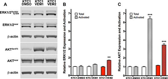 Figure 8: PI3K/AKT and RAF/MEK/ERK pathway activation in KTC1 subpopulations following long-term exposure to DMSO (KTC1-DMSO) or vemurafenib (KTC1-VEM1 and KTC1-VEM2). (A) Western blots probing for activated and total ERK1/2 and AKT. Quantification of (B) ERK1/2 and (C) AKT bands (normalized to β-actin) shows activation of only the PI3K/AKT pathway in the KTC1-VEM1 cells but activation of both PI3K/AKT and RAF/MEK/ERK pathways in the BRAF V600E/KRAS G12D mutant cells (KTC1-VEM2, red bars) compared with the control cells (KTC1-DMSO).
