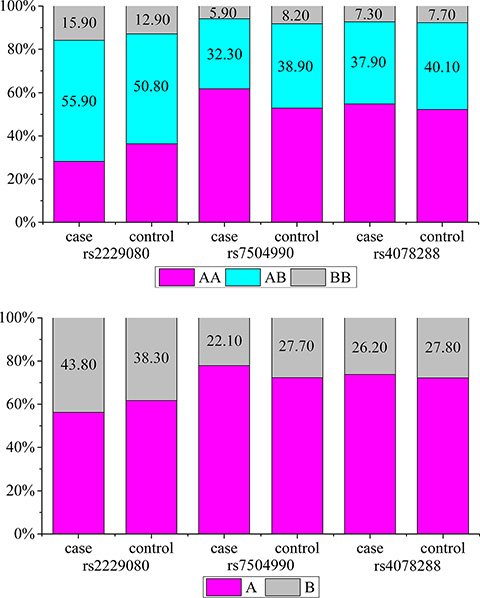 Figure 1: (A) Genotype frequencies of the DCC polymorphisms among the cases and controls. (B) Allele frequencies of the DCC polymorphisms among the cases and controls. (A) the major allele; (B) the minor allele.