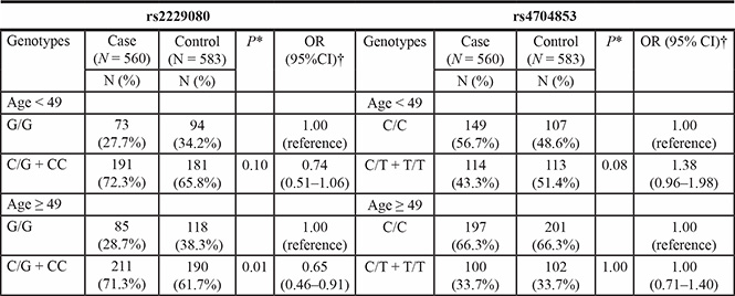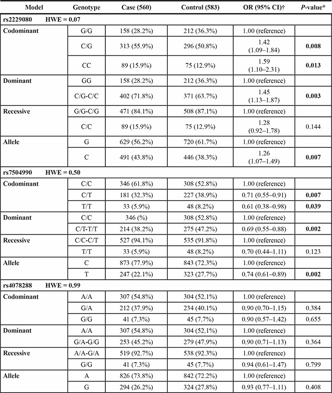 The characteristics of the 560 BC cases and 583 controls are presented in Table 1. The mean ages of patients with BC and healthy controls were 49.09 ± 11.02 and 48.80 ± 8.28 years, respectively. No significant differences were noted between BC cases and controls in terms of the age distribution (P = 0.612) and menopausal status (P = 0.716). However, the body mass index of BC patients significantly differed from health controls (P = 0.038). Therefore, statistical analysis based on case-control comparisons was adjusted for BMI.