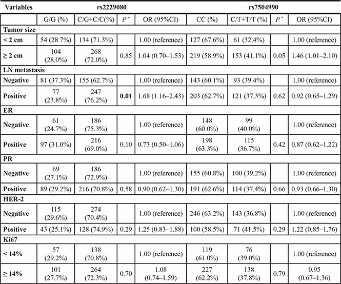 To investigate whether DCC variants were associated with the clinical features of patients with BC, we further analyzed the distributions of DCC variants with respect to a series of clinicopathological parameters including tumor size; axillary lymph node (LN) metastasis; and estrogen receptor (ER), progesterone receptor (PR), human epidermal growth factor receptor 2 (HER-2), and Ki67 index statuses. As shown in Table 3, rs2229080 was associated with LN metastais in patients with BC (P = 0.01). However, no significant correlations were detected between the rs7504990 or rs4704853 polymorphisms and clinical features of patients with BC (data not shown).