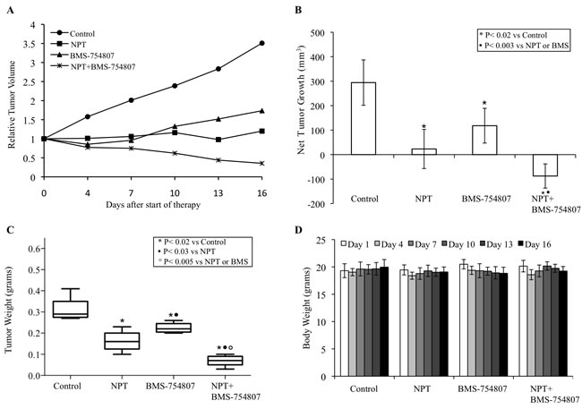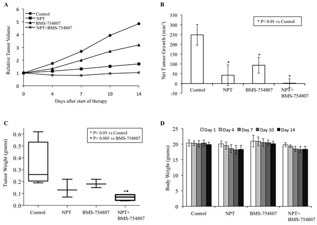 Figure 2: Antitumor activity of nab-paclitaxel and BMS-754807 in Panc-1 tumor xenografts. Panc-1 cells were subcutaneously injected in nude mice and treated with nab-paclitaxel and BMS-754807 for 2 weeks. Tumor volume was measured twice a week using calipers. A. Relative tumor volume is calculated by dividing the tumor volume at any time by the tumor volume at the start of treatment. B. Net tumor growth was calculated by subtracting tumor volume on the first treatment day from that on the final day. C. Mean tumor weight was calculated from final day tumor weights in each group and is presented as a box plot. Box height denotes interquartile range; horizontal line within the box denotes median; and whiskers represent minimum and maximum values. D. Mouse body weight was measured twice a week and presented as bar chart for the 2-week therapy period. Data are representative of mean values ± standard deviation from 6-8 mice per group.