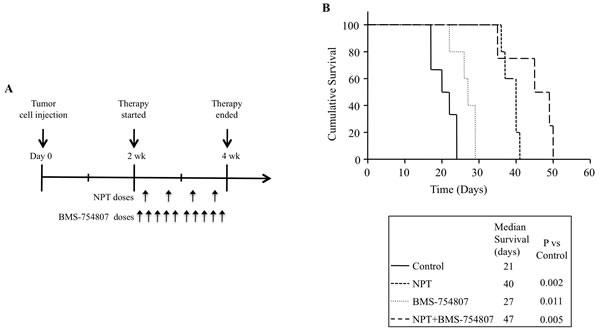 Figure 3: Improvement in animal survival by nab-paclitaxel and BMS-754807. A. Schematic representation of experimental procedure. AsPC-1 cells (0.75 x 106) were injected intraperitoneally in NOD/SCID mice and treatment started after 2 weeks with nab-paclitaxel and BMS-754807 for 2 weeks. B. The curve represents the animal survival time from the beginning of therapy. Statistical group differences in survival time were calculated using logrank testing (GraphPad Prism 6.0).