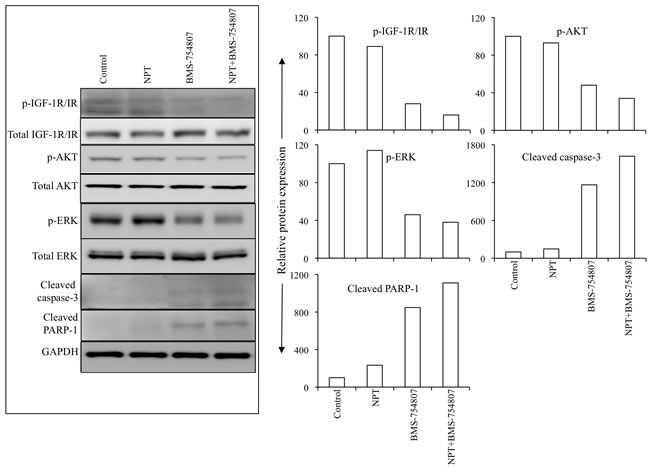 Figure 5: Nab-paclitaxel and BMS-754807 effects on the IGF signaling pathways and apoptosis-related proteins in vivo. Tumor lysates were prepared from tumor tissues obtained from AsPC-1 tumor-bearing mice and were analyzed by immunoblotting. Data are representative of pooled lysates obtained from tumor sections of at least 5 mice in each therapy group. The intensity of bands was quantitated by densitometry and is represented in the bar graph after normalizing values with corresponding total protein expression or GAPDH expression.