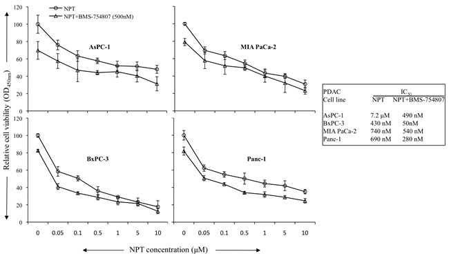 Figure 6: Addition of BMS-754807 had additive effects in combination with nab-paclitaxel to inhibit in vitro cell proliferation of PDAC cells. PDAC cells were plated on 96-well plates and treated with nab-paclitaxel (0 to 10 μM) as depicted through the open circle line. Another group of cells were treated with IC25 dose of BMS-754807 (500 μM) and nab-paclitaxel as depicted through the open triangle line. After 72 hours, 10 μl WST-1 reagent was added in each well and incubated for 2 additional hours. The absorbance at 450 nm was measured using a microplate reader. The resulting number of viable cells was calculated by measuring absorbance of color produced in each well. Data are the mean ± SD of triplicate determinations.