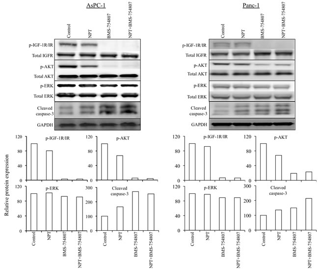 Figure 7: Nab-paclitaxel and BMS-754807 effects on the IGF signaling pathway and apoptosis-related proteins. A sub-confluent monolayer of human PDAC cells AsPC-1 and Panc-1 was treated with nab-paclitaxel (10 μM) and BMS-754807 (10 μM), either alone or in combination for 16 hours. Total cell extracts were analyzed by immunoblotting. The intensity of bands was quantitated by densitometry and is represented in the bar graph after normalizing values with corresponding total protein expression or GAPDH expression. Data are representative of two independent experiments with similar results.