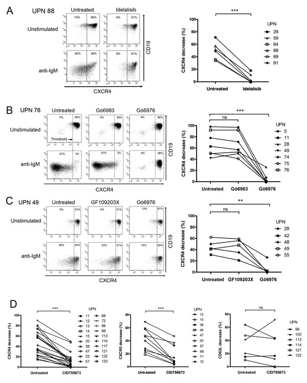 Our data support that the intensity of CXCR4 downregulation reflects the proportion of the BCR responsive subclone in a given patient. Indeed, we have shown previously that CXCR4 and CD62L downregulation occurred concomittanly upon BCR triggering [10] and we currently demonstrated that intensity of CXCR4 and CXCR5 downregulation took place in a similar subset of cells. PI3K-δ inhibitors allow CLL cells to exit from lymph nodes in vivo and represent an effective therapy. Interestingly, PKD inhibitors were shown to block pancreatic cancer growth in a xenograft mouse model [63]. Given the PKD implication in BCR-dependent CXCR4/CXCR5 internalization and CLL cell migration, targeting PKD could be an interesting alternative therapeutic option that would circumvent the PI3K-δ inhibitors side effects that target ΑΚΤ/mTor signaling pathways [64].