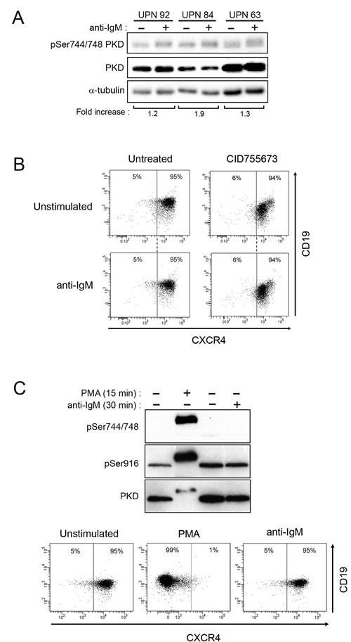 Figure 5: BCR-unresponsive cells respond to PMA treatment. A. CLL cells were stimulated and analyzed as described in Fig. 4C. B. Upon stimulation or not with anti-IgM and with or not 24 h-treatment with CID755673, CXCR4 and CD19 expressions were determined by flow cytometry (UPN 50). C. CLL cells (UPN 4) were stimulated (+) or not (-) with anti-IgM or PMA (200 nM) for the indicated time. Phosphorylated (Ser744/748 and Ser916) and total PKD (PKD1/2) were analysed by western blotting (top). After 24 hours, CXCR4 and CD19 expressions were determined by flow cytometry (bottom).