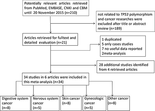 We retrieved the literatures from PubMed and EMBASE using the search terms described in methods section without language restriction. We first excluded 189 publications not concerning the TP53 polymorphism and cancer after a title and abstract screening. Then the remaining 21 articles were carefully full-text reviewed. As a result, 15 publications were further removed for the following reasons:1 study was duplicated with study included in the meta-analysis; 5 were case only studies;7 had no adequate data to calculate OR and 95% CI; 2 were meta-analysis. Finally, only 6 studies were included in the final analysis (Figure 1) [15–20]. Moreover, we retrieved 34 separated investigations from 4 studies [15–18]. After all the steps of literature review, 34 studies including 36599 cases and 91,272 controls were ultimately included in our meta-analysis (Table 1). Among them, there were 8 studies on digestive system cancer, 5 on nervous system cancer, 8 on skin cancer, 5 on gynecologic cancer, 8 on other cancer. Moreover, 6 studies were considered as low quality (quality score < 10), and 28 studies were considered as high quality (quality score ≥ 10). In the included studies, all the cancer cases were histologically confirmed, and controls were matched to cases by sex, age and ethnicity in 24 studies.