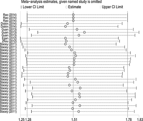 To evaluate the influence of individual study on the pooled ORs, we excluded one study at each time, then recalculated ORs and 95% CIs. As a result, we found that none of single study substantially changed the corresponding pooled ORs and 95% CIs (Figure 5). The sensitivity analysis indicated that our analysis was statistically robust.