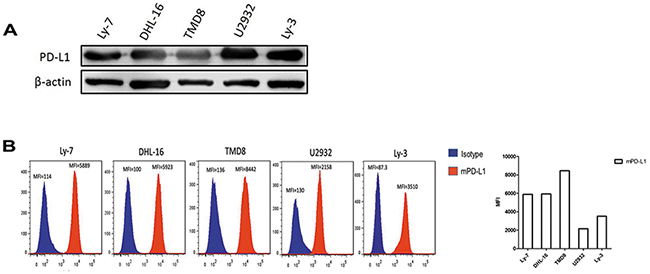 Figure 4: PD-L1 and mPD-L1 expressed widely in DLBCL cell lines. A. Total PD-L1 protein expression in DLBCL cell lines detected by western blot. B. mPD-L1 expression in DLBCL cell lines detected by flow cytometry.