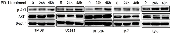 To further determine whether PD-1/PD-L1 binding could directly activate the intracellular AKT/mTOR signaling in tumor cells, DLBCL cell lines were treated with human recombinant PD1/Fc for 24h and 48h. Total and phosphorylated AKT expressions were evaluated by western blot. Results revealed that p-AKT level was significantly up-regulated in three DLBLC cell lines including DHL-16, U2932 and Ly-3, suggesting that the intracellular AKT/mTOR pathway in DLBCL cells was activated (Figure 5). Taken together, we found that intracellular AKT/mTOR signaling could be directly activated by PD-1/PD-L1 binding in DLBCL cells. It revealed that the combination of PD-1/PD-L1 antibodies and AKT/mTOR inhibitor might be a promising and novel therapeutic approach for DLBCL in the future.