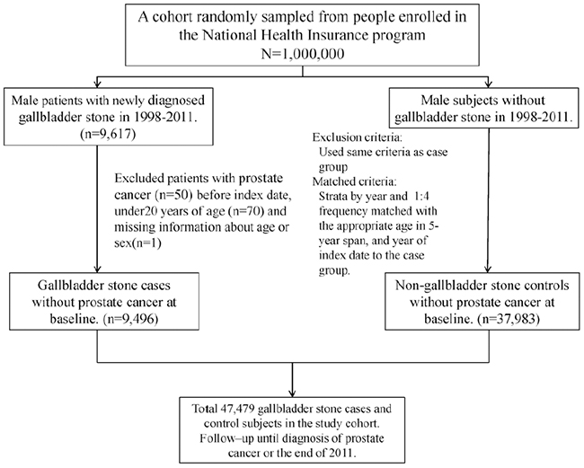 Male patients aged ≥20 years with newly diagnosed GSD (ICD-9-CM codes 574.0, 574.1, 574.2, 574.6, 574.7, 574.8, 574.9) from 1998–2011 were identified using the LHID2000. The date of GSD diagnosis was defined as the index date. Patients with a history of prostate cancer (ICD-9-CM code 185) were excluded. The non-GSD cohort consisted of patients randomly selected from the LHID2000 without a GSD history. For each GSD case, 4 men without GSD were randomly selected as the control cohort through frequency matching according to sex, age (every 5-y span), and the index date year. The same exclusion criteria were also applied to non-GSD controls. Figure 1 provided a flow chart to summarize the study design and the subjects’ selection in this study.