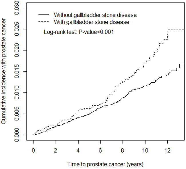 In conclusion, our population-based cohort study indicates that GSD is associated with an increased risk of developing prostate cancer. The risk of prostate cancer increased with the time of follow-up after a diagnosis of GSD, particularly after 9 years of follow-up. However, further studies are required to clarify whether GSD is a causal risk factor for prostate cancer.