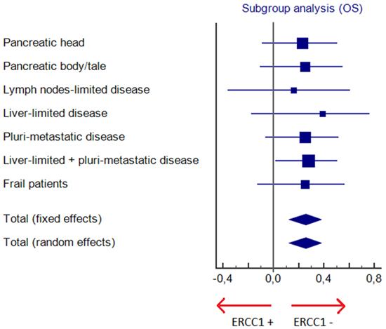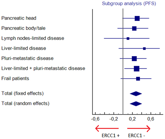 Therefore, the prognostic or predictive role of ERCC1 in pancreatic cancer is still unclear and the present analysis is to our knowledge the first study in a cohort of patients with mPC treated in first-line with the same oxaliplatin containing regimen. Despite the small sample size and the retrospective nature, in our study ERCC1 expression levels were strongly associated with all clinical parameters of efficacy resulting significantly lower in patients overexpressing ERCC1, in agreement with the hypothesis arising from its biochemical action. In the present study median PFS and median OS of the whole population considered are 7 months and 12 months, similar to results of the ACCORD trial in which FOLFIRINOX - compared to gemcitabine as monochemotherapy - met both the primary endpoint (OS) and secondary endpoints (PFS and quality of life, QoL). In our study, despite some unbalancement in characteristics of the two groups, in particular the higher percentage of patients with only lymph nodes involvement in ERCC1- group, ERCC1- patients achieved a 4-months advantage both in PFS and OS when compared to ERCC1+ patients, that means an increase of 50% and 30% in PFS and OS, respectively. The survival advantage in ERCC1- cohort was confirmed in all subgroups (Figures 3-4) and was independent from primary site (pancreatic head or body/tale), number and site of metastases (lymph nodes-limited disease, liver-limited disease, pluri-metastatic disease) and patients’ frailty. Also DCR was higher in patients with normal levels of ERCC1 and this result was statistically significant in all subgroups, except for patients with lymph node-limited and liver-limited disease, suggesting that the prevalence of locally advanced patients in ERCC1- subgroup probably does not represent a significant bias. The greater efficacy of FOLFIRINOX in ERCC1- arm was emphasized by the larger proportion of patients in this subgroup who completed 12 courses of chemotherapy (83% in ERCC1- arm and 23% in ERCC1+ arm; p< .0001), due to a better disease control rate as well as to improved performance status. In addition, we demonstrated that no survival advantage was seen in second-line setting according to ERCC1 status, suggesting that the survival advantage in terms of OS for ERCC1- group is mainly due to FOLFIRINOX treatment.