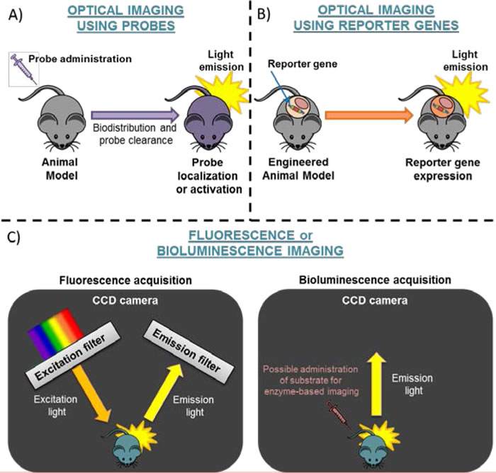 Figure 1: Schematic representation of Optical Imaging. The strategies for optical imaging are based on: A. administration of probes or B. use of engineered mice expressing a reporter gene. Panel C. shows Fluorescence (dark box on the left side) or Bioluminescence Acquisition (dark box on the right side). CCD camera=Charged-Coupled Device camera.