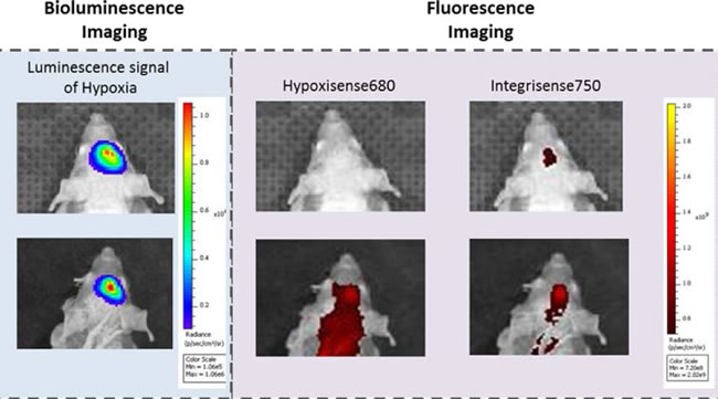 FLI has several advantages: first, it does not require the administration of a substrate that has to be enzymatically modified to emit photons. Second, it allows to exploit different fluorophores with different spectra of excitation and emission (Table 1), characterized by high quantum yield and high penetration in tissues, to acquire multiple signals monitoring different processes in the same experimental animal. Third, the same fluorescent signal can be used for the in vivo monitoring of a specific molecular process and its ex vivo validation by fluorescence microscopy. Last but not least, the availability of several specific probes for different processes has eliminated the need of developing new reporter gene expressing models, speeding up the translation of pre-clinical data into the clinics.