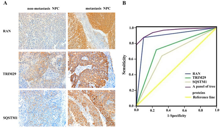 Figure 2: Expressional changes of TRIM29, RAN, and SQSTM1 in NPC tissues and their efficacy in discriminating metastatic NPC from non-metastatic NPC. A. A representative result of immunohistochemistry shows the expression of RAN, SQSTM1, and TRIM29 in the metastatic NPC and non-metastatic NPC. Original magnification: ×200. B. Receiver operating characteristic (ROC) curves of RAN, SQSTM1, TRIM29 in discriminating metastatic NPC from non-metastatic NPC.