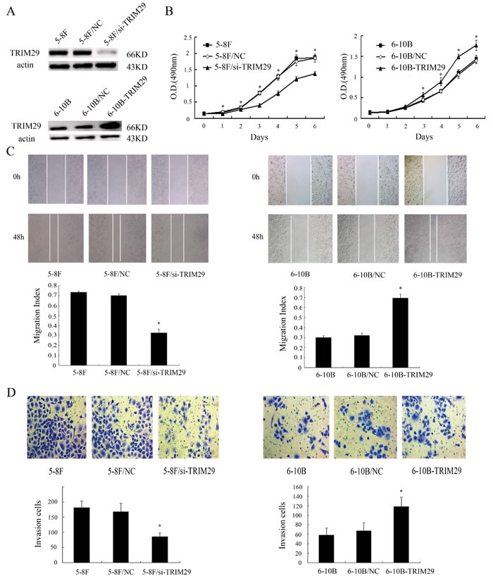 The tripartite motif (TRIM) family is composed of multidomain ubiquitin E3 ligases, and characterized by the presence of the N-terminal tripartite motif (RING, B-boxes, and coiled coil). Currently, more than 70 members of TRIM family have been identified in humans. These proteins participate in cell growth and development regulation, and have been implicated in several human diseases such as HIV infection and leukemia [16, 17]. TRIM29 is a member of the tripartite motif (TRIM) family [18]. Several studies have shown that TRIM29 plays an important role in the various types of cancers [19-27]. However, to our best knowledge, the functions of TRIM29 in NPC have never been characterized.