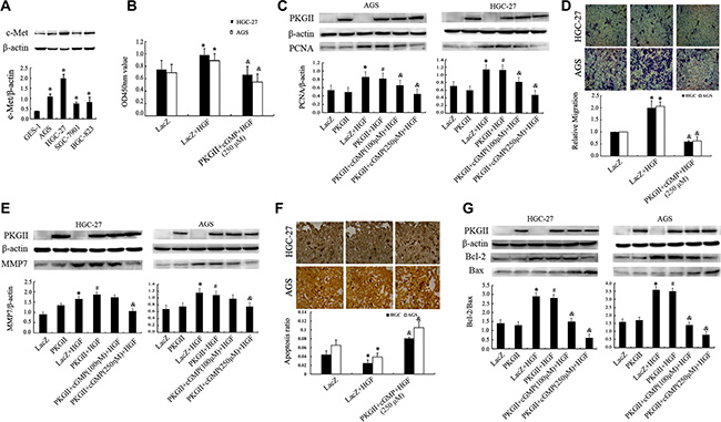 Figure 1: Analysis of the effect of PKG II on HGF-induced changes of proliferation, migration and apoptosis activities. (A) The expression of c-Met in human gastric epithelial cell line GES-1 and gastric cancer cell lines AGS, HGC-27, SGC-7901 and BGC-823. (*P < 0.05, compared to GES-1 cell). (B–G) The detection of proliferation, migration, apoptosis activities and related protein expression. The AGS and HGC-27 cells were infected with either Ad-LacZ or Ad-PKG II, serum-starved for 12 h, stimulated with 8-pCPT-cGMP (100 or 250 μΜ) for 1 h, and then treated with HGF (50 ng/ml) for 24–48 h. (B) The relative proliferation activities were presented. (C) The expression of PCNA was detected by Western blotting with an anti-PCNA antibody. (D) The transwell migration assay was applied to detect the migration activity. The representative data showed the relative activities of migration. (E) The expression of MMP7 was detected by Western blotting with an anti-MMP7 antibody. (F) TUNEL method was applied to analyze the apoptosis activity, and the average ratio of apoptotic cells per field (magnification, × 200) was shown. (G) Detection of Bax and Bcl-2 protein by Western blotting in different groups. (*P < 0.05, compared to LacZ group; #P < 0.05, compared to PKG II group; &P < 0.05, compared to LacZ+HGF group, or PKG II+HGF group).