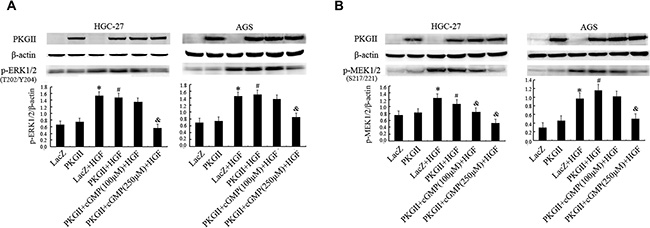 Figure 2: Analysis of the effect of PKG II on the activation of main components in MAPK/ERK pathway induced by HGF. The AGS and HGC-27 cells were treated same as in Figure 1, excepting that the HGF (50 ng/ml) treatment is 10 min. (A) The phosphorylation of ERK1/2 in different group was detected by Western blotting with antibody against p-ERK1/2 (Thr 202/Tyr 204). (B) The phosphorylation of MEK1/2 in different group was detected by Western blotting with antibody against p-MEK1/2 (Ser217/221). (*P < 0.05, compared to LacZ group; #P < 0.05, compared to PKG II group; &P < 0.05, compared to LacZ+HGF group, or PKG II+HGF group).