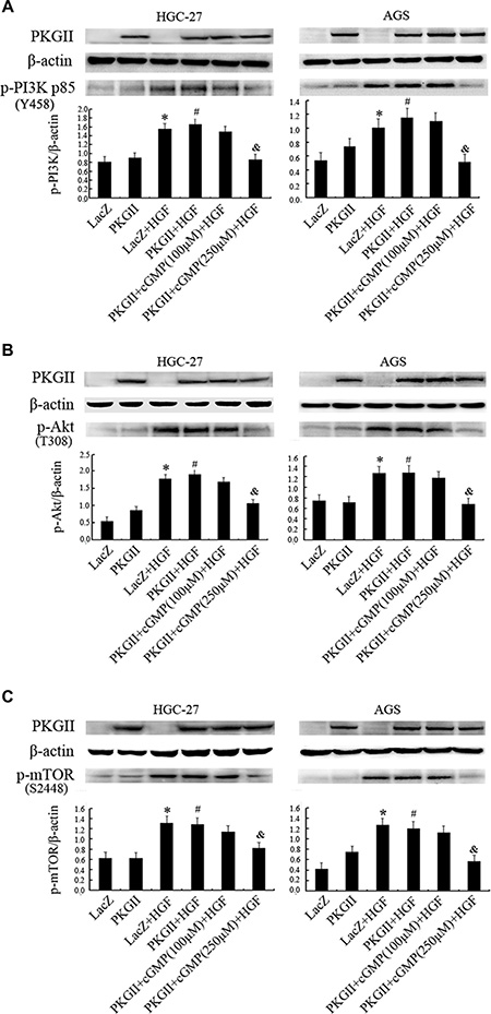 Figure 3: Analysis of the effect of PKG II on the activation of main components in PI3K/Akt/mTOR pathway induced by HGF. The AGS and HGC-27 cells were treated with the same conditions as in Figure 2. (A) Western blotting was performed to detect the phosphorylation of PI3K p85 at Tyr 458 site in different groups. (B) The phosphorylation of Akt were detected by Western blotting with antibody against p- Akt (Thr 308). (C) Western blot analysis of Ser2448 phosphorylation of mTOR in different groups. (*P < 0.05, compared to LacZ group; #P < 0.05, compared to PKG II group; &P < 0.05, compared to LacZ+HGF group, or PKG II+HGF group).