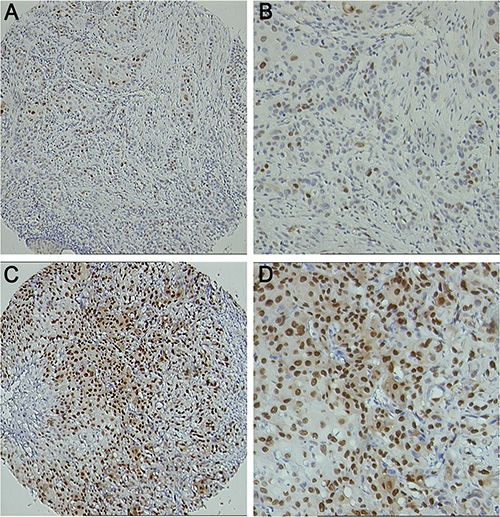 We prepared tissue microarrays for IHC staining to determine uniform and simultaneous protein expression in multiple tissue samples. For each patient sample, three tissue cylinders were taken from different representative tumor regions to generate the tissue microarrays [24]. The rabbit cyclin D1 monoclonal antibody (RM-9104-S0, 1:100, Neomarkers) was used as the first antibody for IHC staining, and the detailed methods for tissue microarray construction, IHC staining, and scoring were described elsewhere [24]. Two independent observers (RZ Luo and JH He) blinded to the clinicopathological information determined the immunoreactivity score (IRS) for cyclin D1 staining. The staining results were scored based on the following criteria: (a) percentage of positive tumor cells in the tumor tissue: zero (0%), one (1%–10%), two (11%–25%), three (26%–50%), four (51%–75%), or five (76%–100%); and (b) signal intensity: zero (no staining), one (weak staining), two (moderate staining), or three (strong staining) [24, 26–28]. The IRS was calculated by multiplying the score for the percentage of positive cells by the intensity score (range of 0 to 15) [24, 26–28]. If the conclusion was still controversial after the specimens were rescored, then a third pathologist intervened and worked collaboratively to reach a consensus. The average IRS of each core determined by the two pathologists was assigned as the staining result for the core. The average IRS of three cores for each case was assigned as the final staining result of the patient.