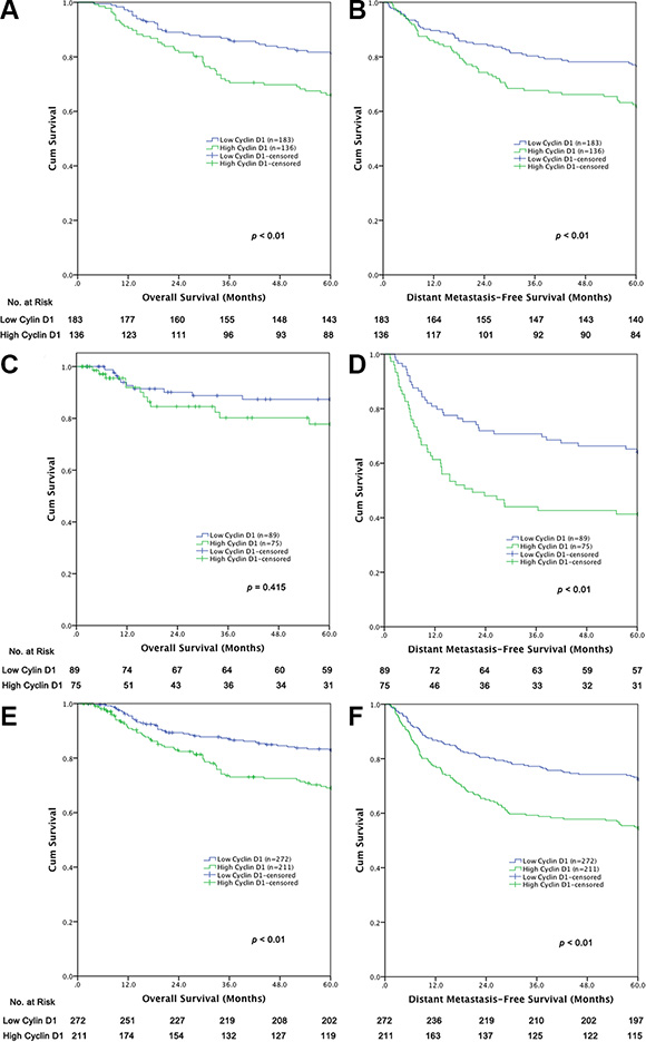 In this study, we investigated the correlation of cyclin D1 expression with postoperative distant metastases, overall survival (OS), and distant metastasis-free survival (DMFS) in resectable ESCC patients using one dataset for training and another independent dataset for validation.