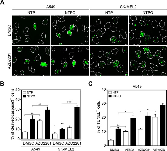 Figure 5: Inhibition of PARP1 augments apoptosis during NTP and NTPO treatment. (A) A549 and SK-MEL2 cells pretreated with a PARP inhibitor during NTP and NTPO treatment were stained for cleaved-caspase 3, and Hoechst-stained nuclei were depicted as dotted lines. (B) The quantitative analysis for (A). The bars and error bars represent the mean ± SD from three independent experiments. (C) A TUNEL assay was performed in A549 cells pretreated with ATR, PARP, or ATR + PARP inhibitor during NTP and NTPO treatment. Bars and error bars represent the mean ± SD from three independent experiments (* = p < 0.05; ** = p < 0.01; *** = p < 0.001).