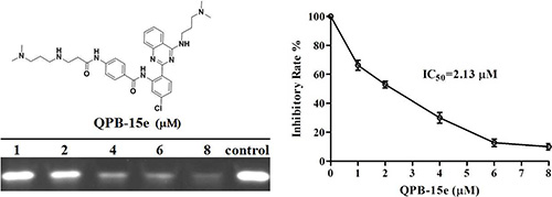 The PCR stop assay was performed using a modified protocol from the Master Cycler Personal (Eppendorf) [19]. The reaction mixture contained 2 μmol Pu27 oligomers (forward: 5 - TGGGGAGGGTGGG GAGGGTGGGGAAGG - 3; reverse: 5 - ATCGATCTCTT CTCGTCCTTCCCCA - 3), 2.5 U Taq polymerase, 0.16 μM dNTP, and a specified concentration of QPB-15e. PCR conditions were as follows: 94°C for 3 min, 10 cycles of 94°C for 30 s, 58°C for 30 s, and 72°C for 30 s. Amplified products were resolved with a 15% non-denaturing polyacrylamide gel in 1 TBE and silver staining.