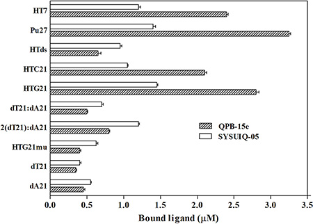 Figure 4: Results of the competition dialysis assay. The amounts of QPB-15e and SYUIQ-05 bound to each structure are presented in a bar graph.
