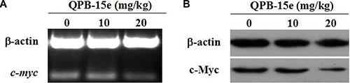 Figure 9: Effects of QPB-5e on c-myc expression in xenograft tumor tissue. RT-PCR (A) and western blotting (B) were conducted to determine c-myc mRNA and protein levels, respectively.