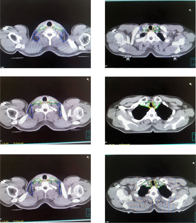 The position of all patients was fixed with thermoplastic omentum after both hands held the contralateral elbow and raised to contact forehead. Then the patients received the enhanced cervical and thoracic CT scan ranging from cricothyroid membrane to costophrenic angle horizontal, with the slice thickness of 5 mm. The CT-images were reconstructed into 3-D images and transmitted into the planning system (USA, Eclipse) after digitization.