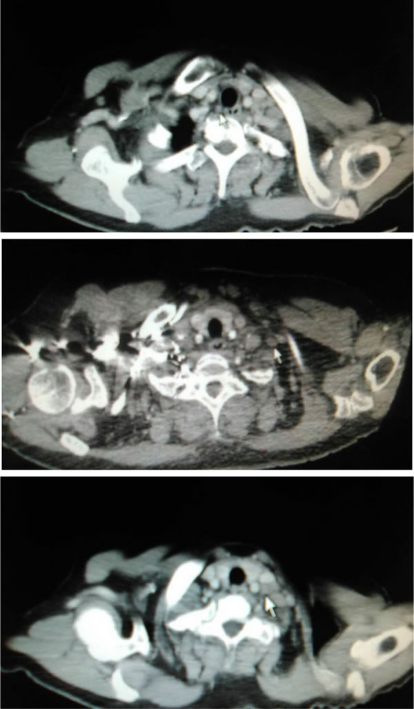 Figure 2: Lymph node metastasis in CTG, MSC and LSC zones, respectively (pointed out by the white arrow).