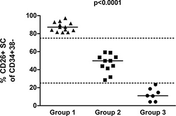 Figure 2: Percentage of CD26+ cells in the CD45+34+38– SC population for the 3 patient groups, as determined by flow cytometry (p < 0.0001; Kruskal-Wallis; ANOVA).