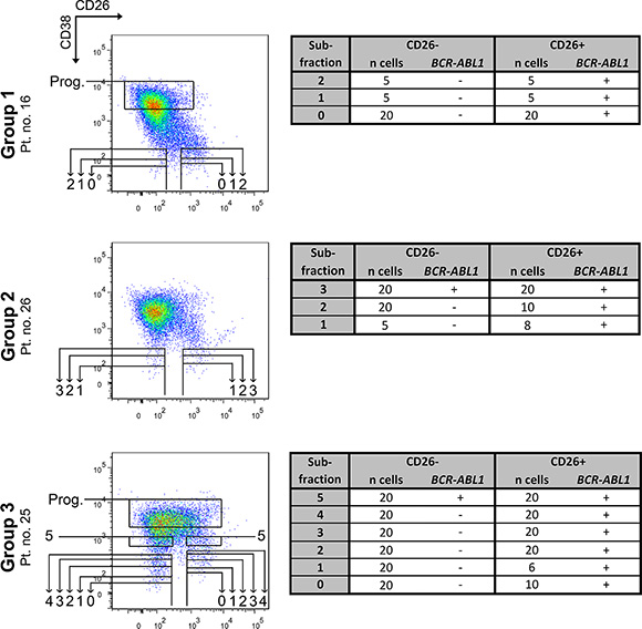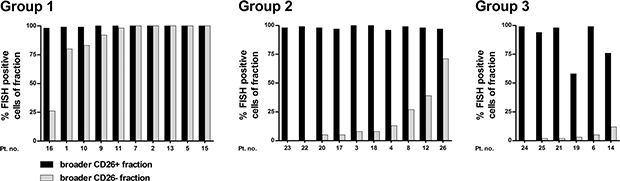 Figure 3: BCR-ABL1 positivity assessed by FISH in FACS-purified broader (CD45+34+38–/dim) CD26+ and CD26– fractions; shown separately for Group 1, 2, and 3. Pt. no. – patient number.