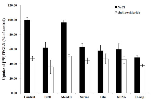 Figure 4: Uptake of [18F]FPGLN in SPC-A-1 cells in presence of inhibitors in the medium of presence and absence of Na+. Values are given as percentage (mean ± SD, n = 15) of uptake in cells that were incubated with or without inhibitors including BCH, MeAIB, serine, L-glutamate(Glu), L-γ-glutamyl-p-nitroanilide (GPNA) and D-aspirate ( D-Asp) in Na+-containing (NaCl) or choline chloride buffer.