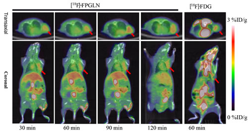 Figure 7: Decay-corrected whole-body PET/CT fusion images of PC-3 prostate cancer-bearing mice after the injection of [18F]FPGLN or [18F]-FDG. The red arrows indicate the tumors.