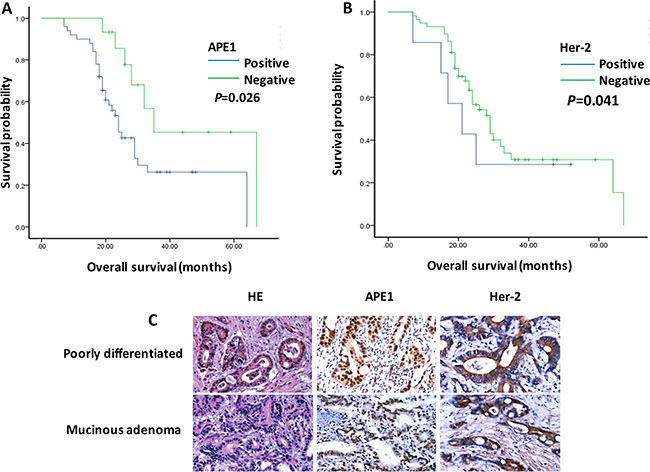 Figure 1: APE1 and Her-2 overexpression associated with poor prognosis of patients with gastric cancer. (A) and (B) The Kaplan-Meier plot analyzed that APE1 and Her-2 positive expression associated with poor overall survival in patients with gastric cancer. (t test; *, P < 0.05) (C). The samples of patients with gastric adenocarcinoma were stained by Hemotoxylin & Eosin (HE) and immunohistochemistry. The expression of APE1 and Her-2 showed in the nucleus, cytoplasm and membrane (brown stain) in gastric cancer cells.