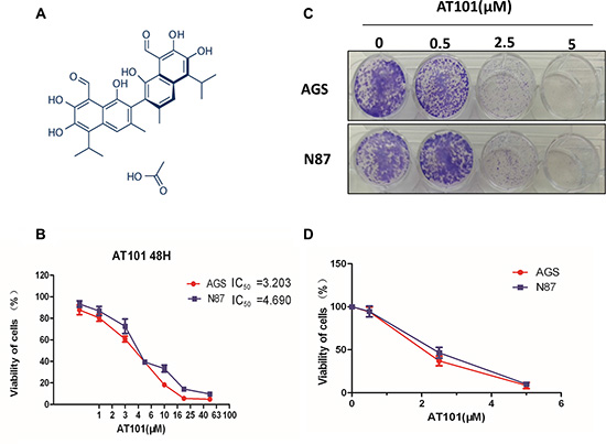 AT101 (Selleckchem Inc, Shanghai, China) was dissolved in DMSO with a stock concentration of 50 mM, and was freshly diluted to the desired concentrations with culture medium. The final concentration of DMSO was at 0.05% (v/v). The MTT assay was performed to examine the effect of AT101 on the viability of AGS and NCI-N87 cells. Briefly, cells were seeded in 96-well culture plates at a density of 8 × l03 cells/well. After attaching, we treated cells with AT101 at different concentrations (0.5–50 μM). The control cells received the vehicle only. After 24 hours incubation, 10 μL MTT (5 g/L) was added to each wells and cultured for 4 hours. Then, 100 μL DMSO was added in the plates. The absorbance at the 570 nm wavelength was measured with a Synergy H4 Hybrid microplate reader (BioTek Inc., Winooski, VT, USA). The IC50 values were analyzed using GraphPad Prism 6.0 (GraphPad Software, Inc., La Jolla, CA, USA).