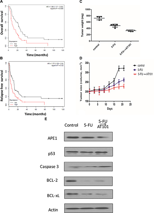 Figure 5: The role of AT101 in the treatment of Her-2 positive gastric cancer with 5-FU based therapy in vivo. (A) Kaplan-Meier plot of 75 patients with Her-2 positive gastric cancer following 5-FU treatment showing low APE1 (n = 32) expression associated with shorter overall survival. (B) Kaplan-Meier plot of 75 patients with Her-2 positive gastric cancer following 5-FU treatment showing low APE1 (n = 39) expression associated with poorer relapse free survival. (C) and (D) The tumor weight and volume of xenograft mice model in 5-FU sequential treatment with AT101 became smaller than those with 5-FU treatment alone. (E) The downregulated of BCL-2 and Bcl-XL and increased caspase 3 expression were shown in a subset of tumors after 5-FU and 5-FU sequential AT101 treatment.